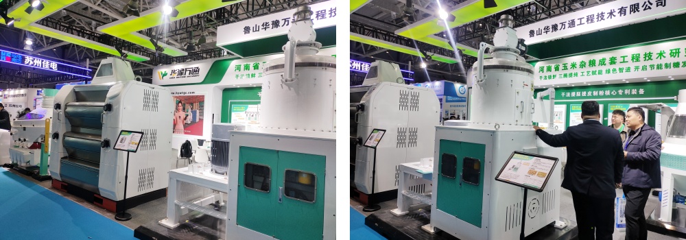 展臺上,華豫萬通展出的智能玉米揉搓脫胚機、智能玉米胚芽搓光機、智能玉米選胚機、氣動伺服磨粉機等玉米提胚制低脂玉米粉核心設備,以高品質的外觀、高精尖的技術吸引了眾多參觀者的目光。該套核心設備能耗低、成品收率高、脂肪含量低、灰分低、綠色環保,可滿足葡萄糖、發酵企業的原料應用。